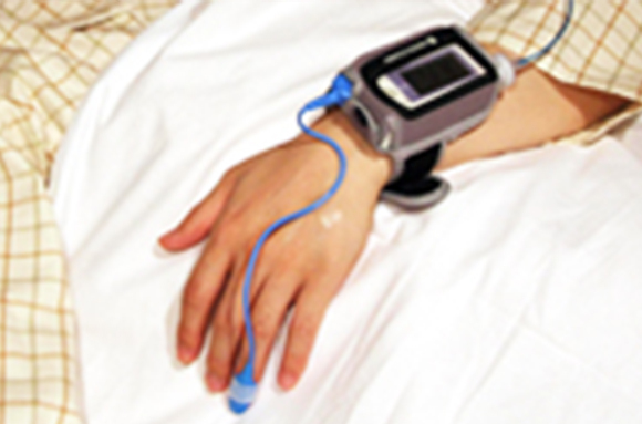 手の指や鼻の下にセンサーをつけ、いびきや呼吸の状態から睡眠時無呼吸症候群(SAS)の可能性を調べます。